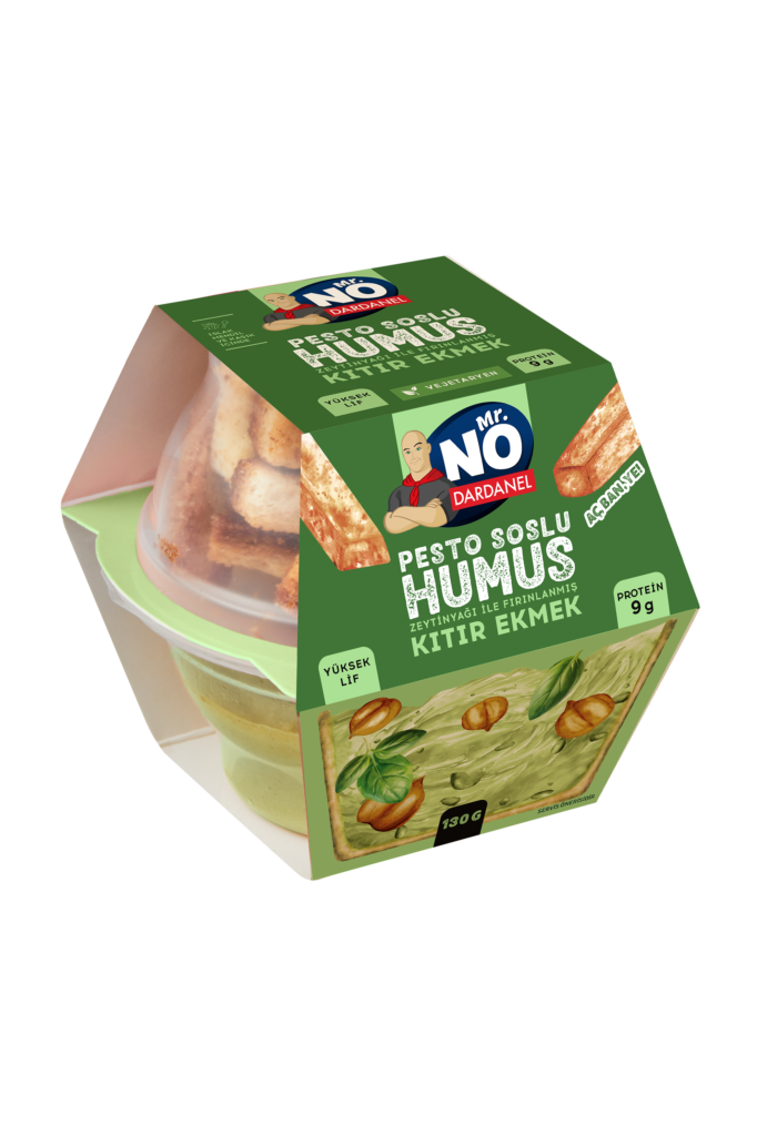 Mr. NO Humus ailesi, klasik ve köz biberli çeşitlerinin yanı sıra şimdi de pesto soslu yeni üyesiyle genişliyor. Pesto sosun aromatik lezzeti ile humusun besleyici yapısını bir araya getiren Mr. NO Pesto Soslu Humus, farklı tatlar arayan tüketicilere hitap ediyor. Vejetaryen beslenmeye uygun olan ürün, ana malzemesi nohut sayesinde 130 gramlık paketinde 9 gram protein içeriyor. Yanında sunulan zeytinyağı ile fırınlanmış kıtır ekmek ise bu lezzeti tamamlayan doyurucu bir eşlikçi oluyor.