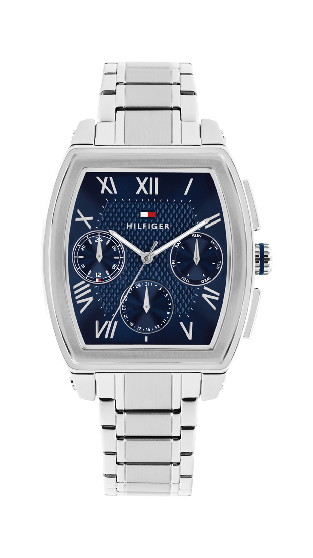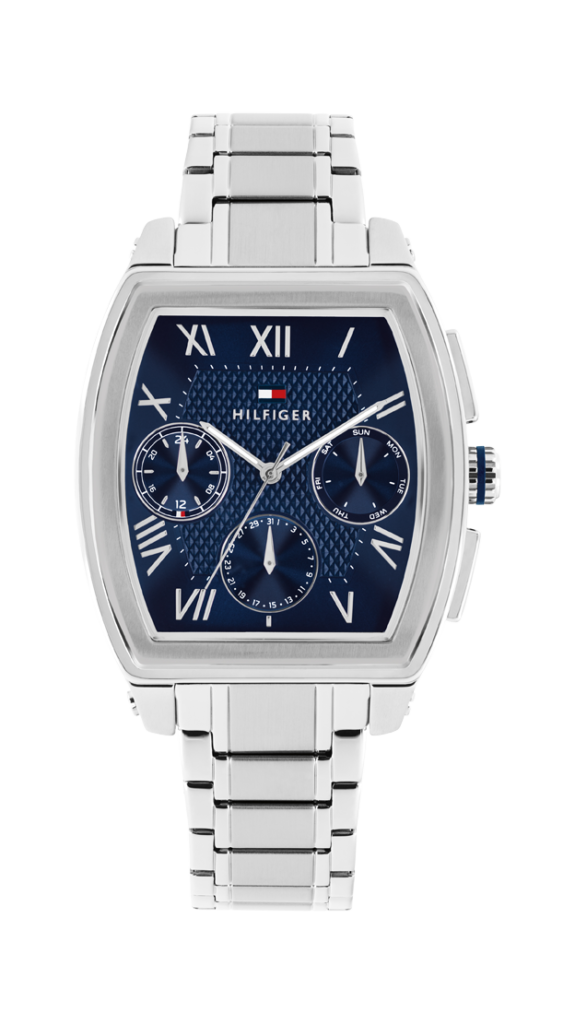 Tommy Hilfiger, 36 mm ölçülerindeki karakteristik tonneau kasa formu ve çelik bileziğiyle güçlü ve dengeli bir siluet sunan modelinde, koyu mavi kadranı sayesinde tasarıma derinlik ve netlik kazandırıyor.