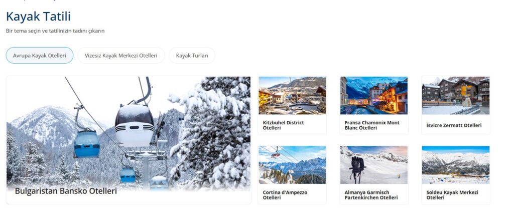 Kayak Tatili Sepetinde kategorisi üzerinden Avrupa’nın önde gelen kayak merkezlerinden Chamonix-Mont-Blanc, St.Moritz, Tignes Kayak Merkezi, Davos-Klosters, Vogel gibi birçok popüler kayak merkezindeki tesislere ulaşılabiliyor. Avusturya, Fransa, Almanya gibi Avrupa’nın en seçkin tesisleri sekmede yer alan harita üzerinden de seçilebiliyor. Yurtdışındaki kayak otellerinde münferit tatil yerine kayak turu tercih edenlere farklı kampanyalar da sunuluyor, havalimanından araç kiralama ve kayak merkezine ulaşım gibi çok detaylı bilgiler de platformda yer alıyor. Vize ile uğraşmak istemeyenler için Bansko gibi vizesiz, kolay erişilebilen kayak merkezleri de ayrıca sıralanıyor.